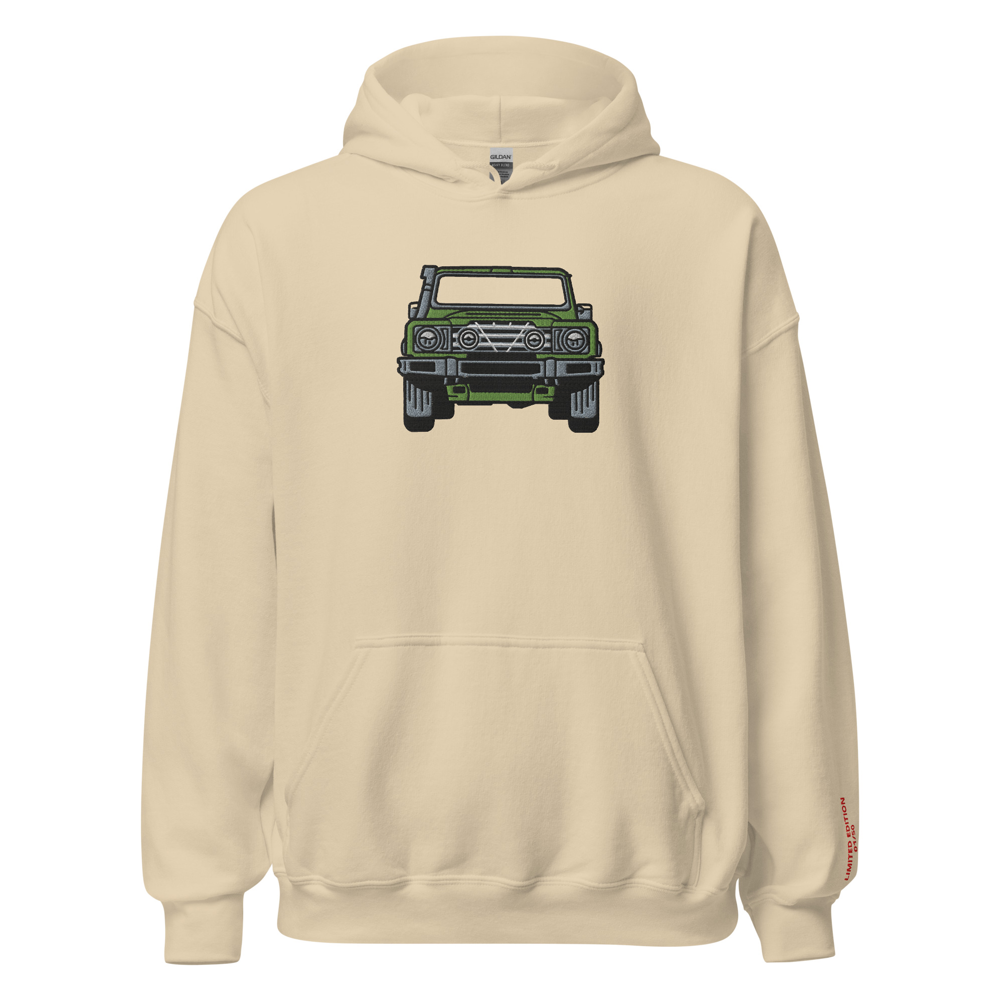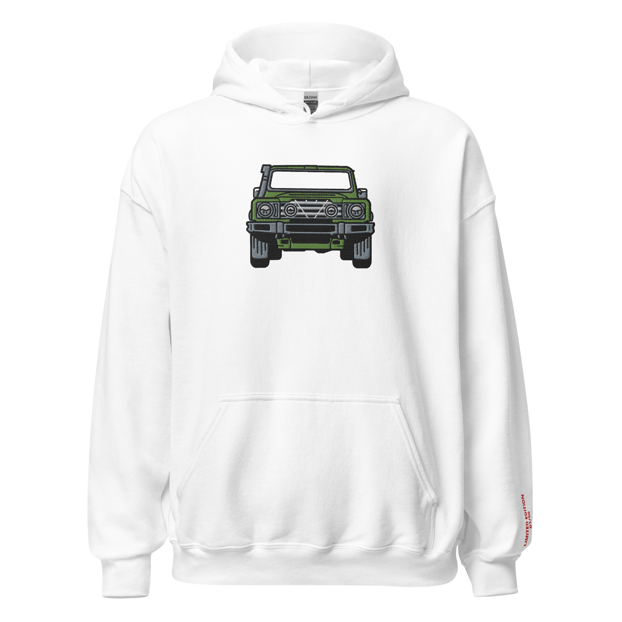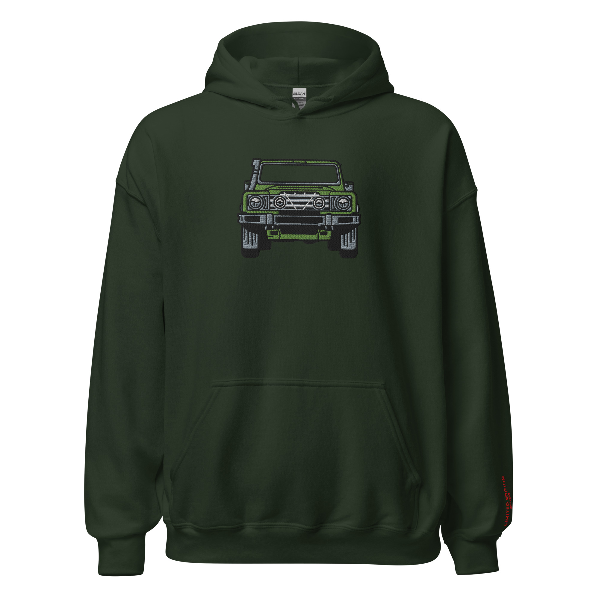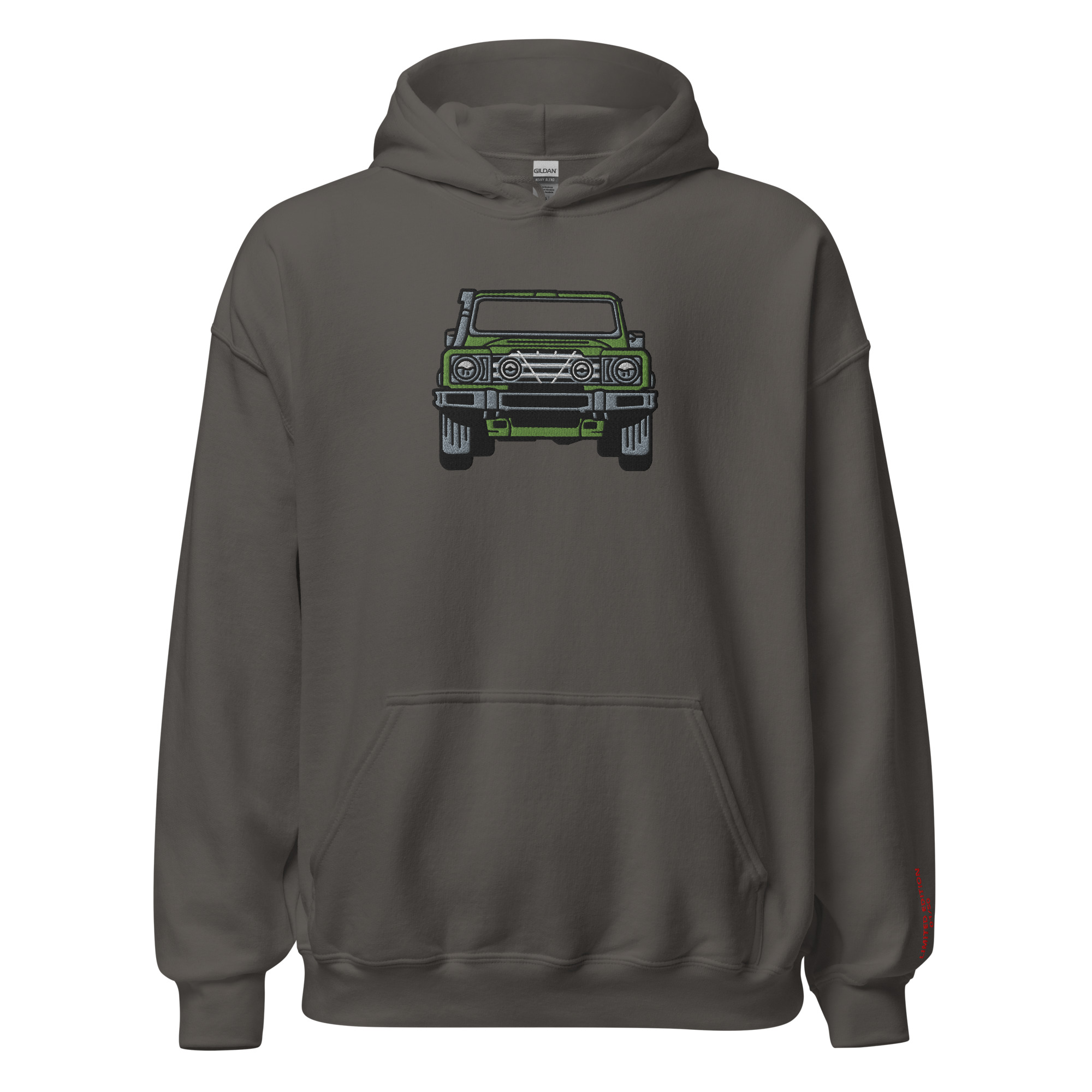 Auf der Brust findet sich eine große Stickerei des robusten Offroaders.