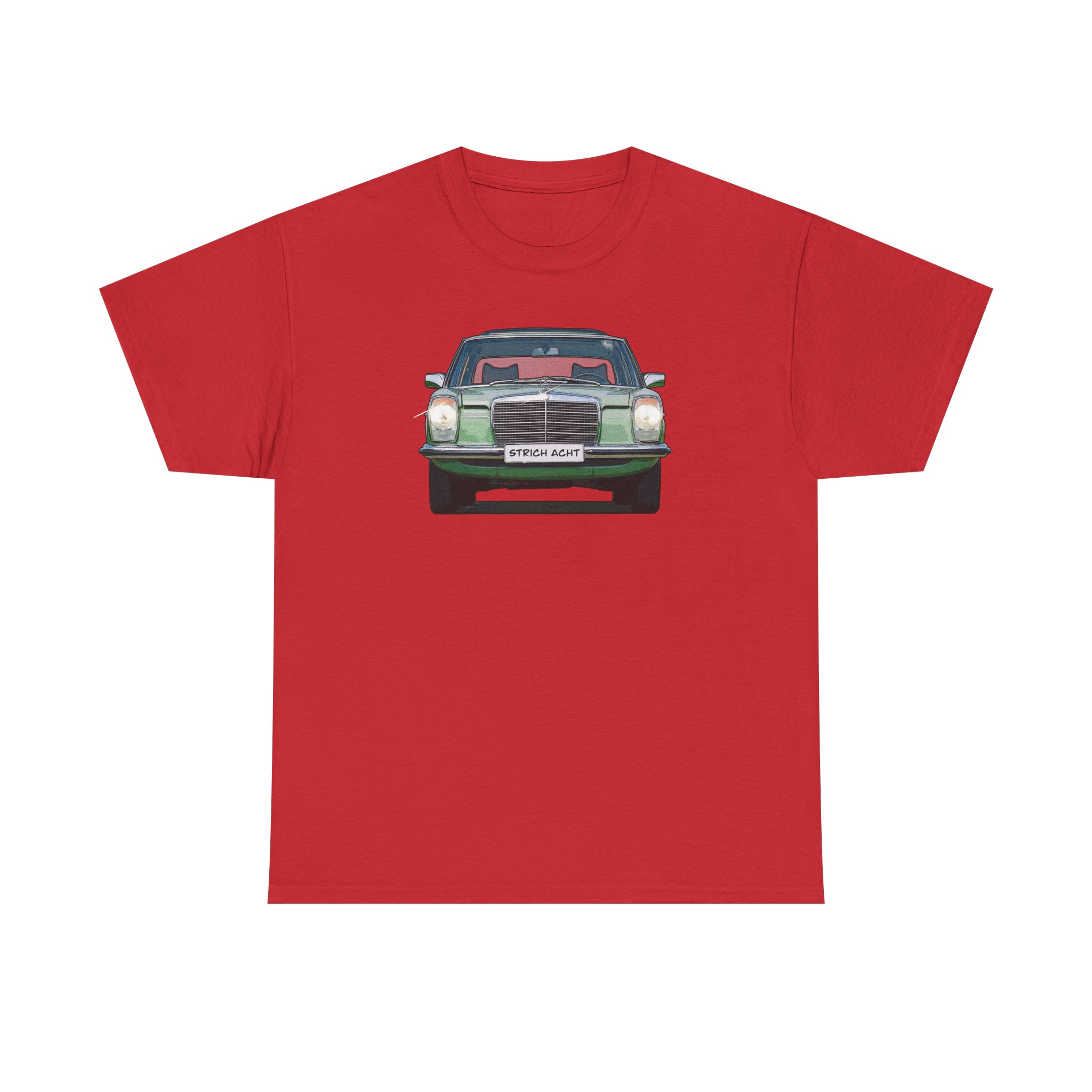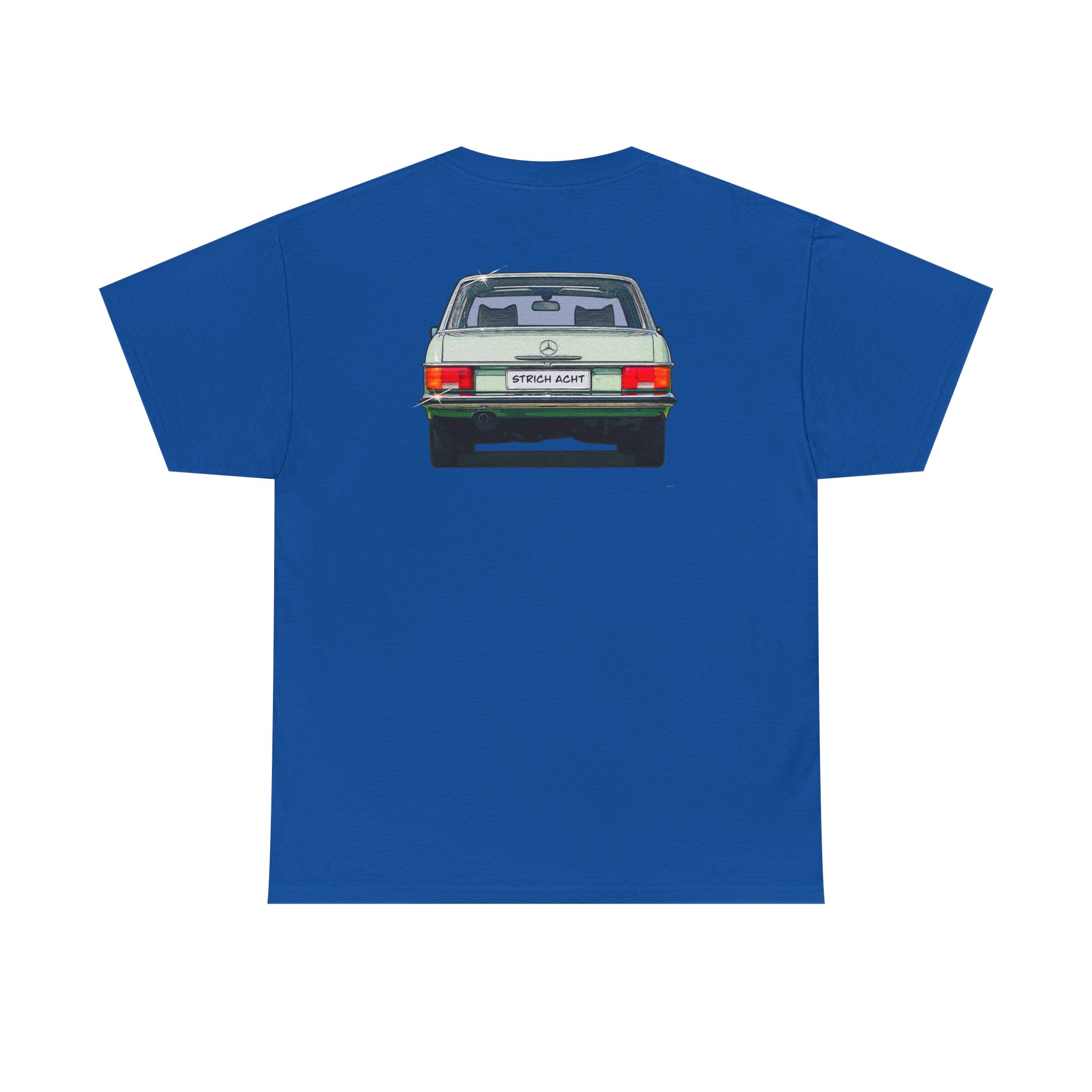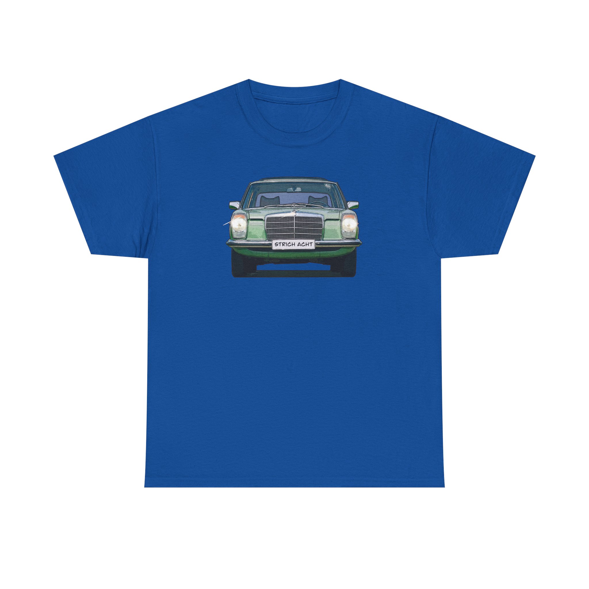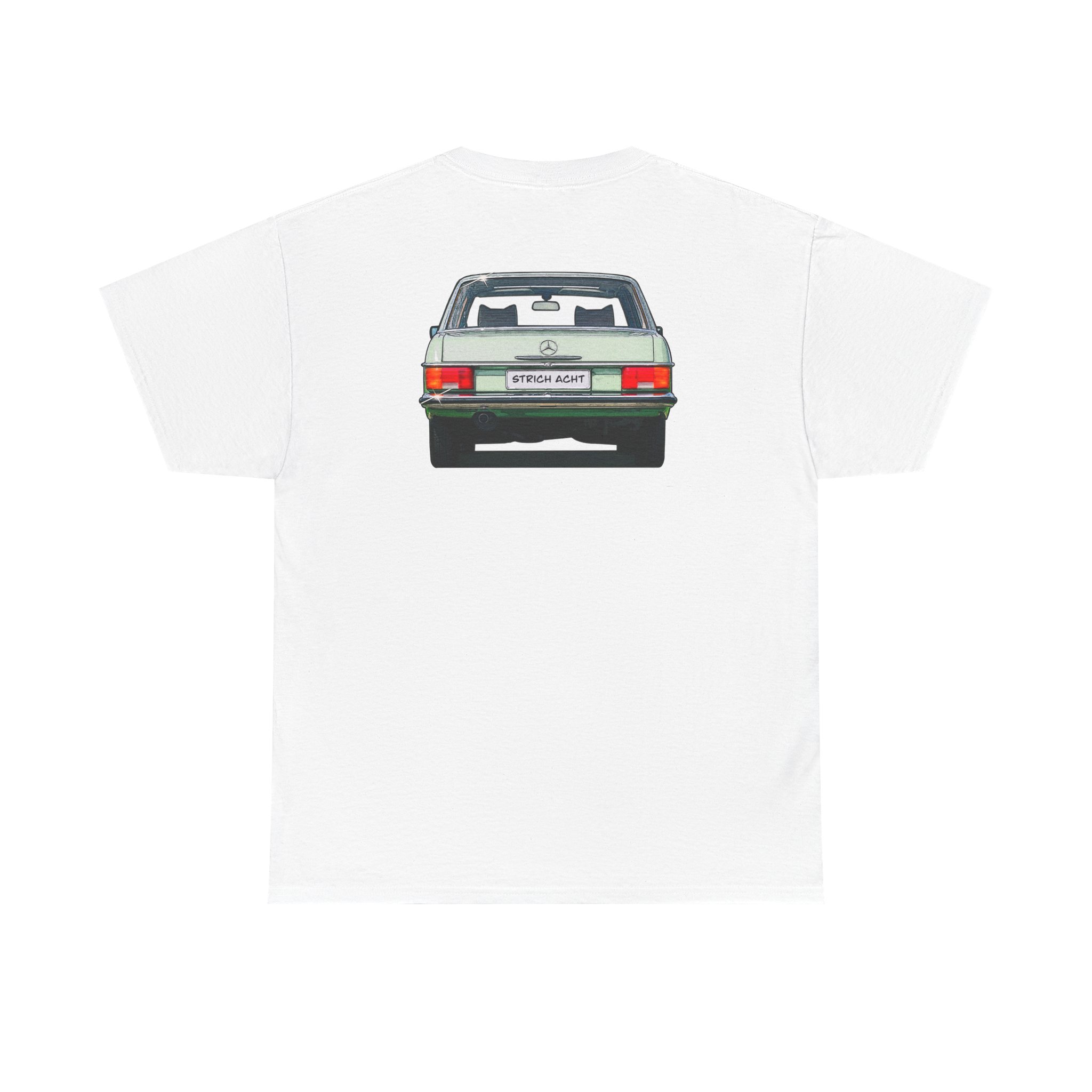 Es zeigt die Frontansicht der Baureihe W114/W115 auf der Shirtvorderseite, sowie die Heckansicht auf der Rückseite.